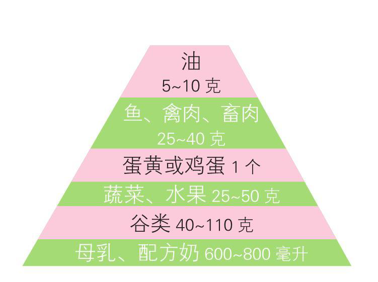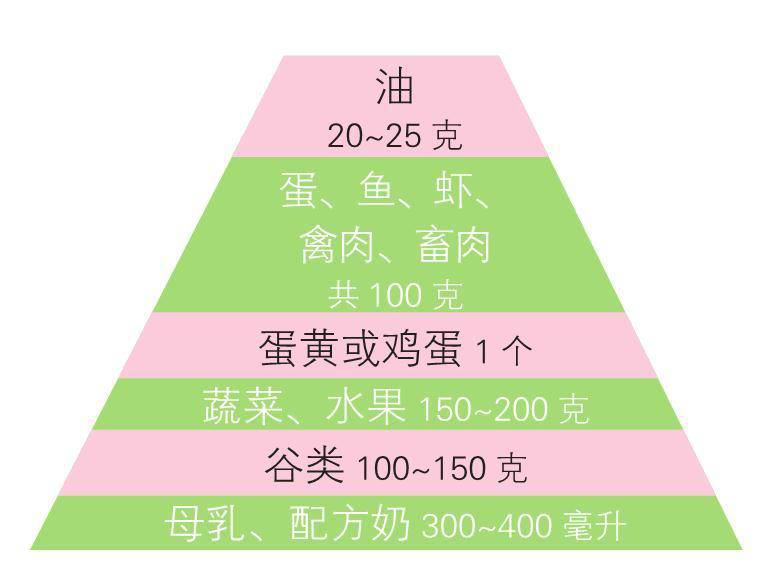 为了保证宝宝的健康生长发育,就要给宝宝制作营养均衡的辅食,食物之间的合理搭配,不仅营养互补,口味也可以相互调和。不会做饭的妈妈,可以经常做点较容易上手的花式粥,将肉、蛋、蔬菜加入米粥同煮,肉早点加容易熟烂,蔬菜要晚点加,以免维生素大量损失。一天食谱的设计,各类食材的分配,以下列两个阶段平衡膳食宝塔为准则。
